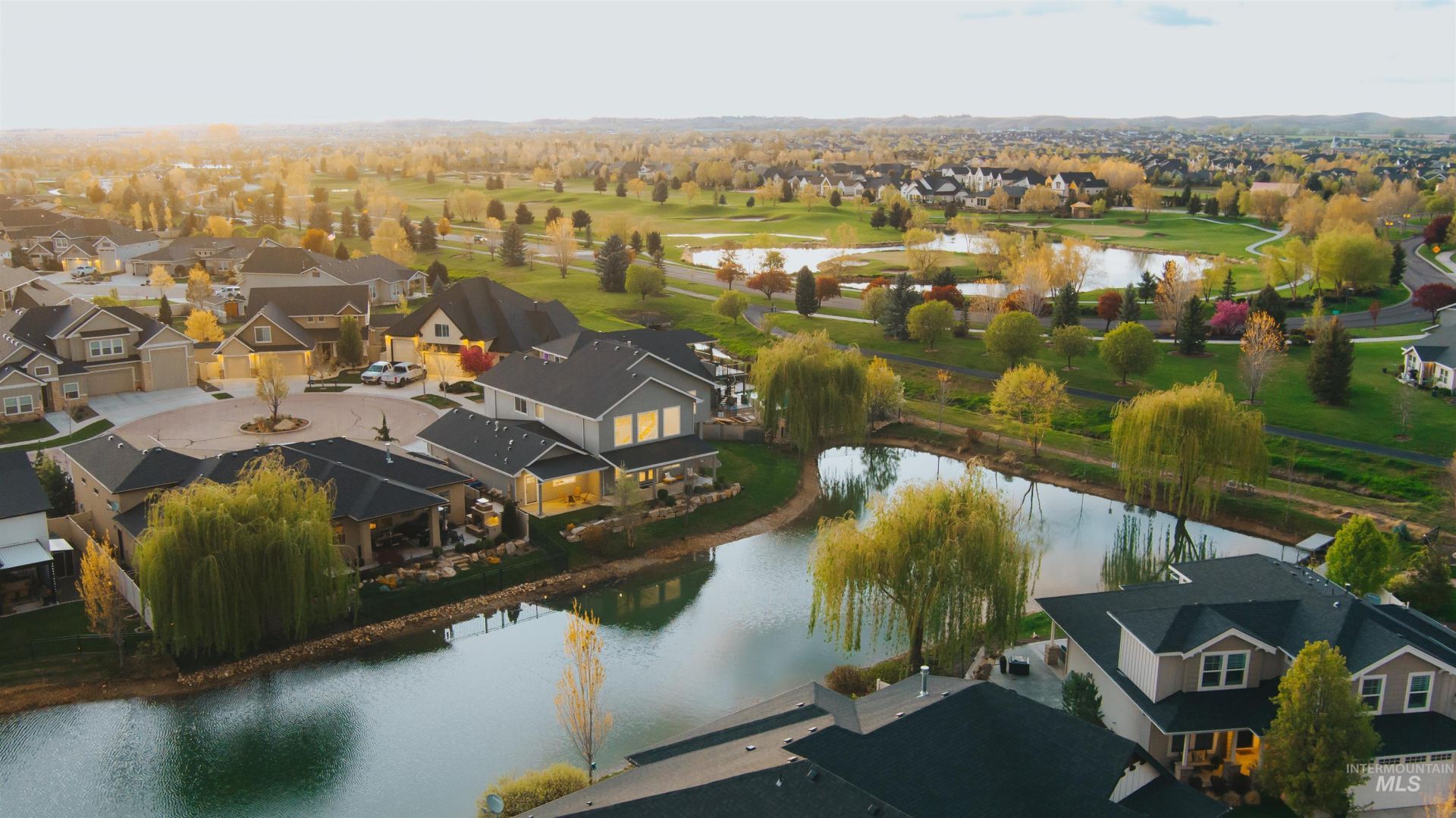 You wont find a better value on the water in Eagle! This custom built home boasts 21 ft. Vaulted ceilings in the fireside room, bringing in tons of natural light and incredible views of the peaceful surroundings. Spend your mornings under the expansive covered patio space (500 sf) and your evenings in the large and modern open concept kitchen which features a luxury 36 inch Z-line Gas Range, spacious walk in pantry, and attached laundry/mud room. Off the entry youll find a bright office as well as a multi-use space set up perfectly for a glare free tv room facing the custom built in media wall. The incredibly generous sized primary suite features an ensuite bathroom with double vanities, a free standing tub, and a dream walk-in shower. Upstairs features 4 additional bedrooms and 2 bathrooms, plus loft seating area to enjoy the stunning views. Dont miss your opportunity to own Eagle waterfront, pond features 2 community docks and a nearly completed cascading rock waterfall.